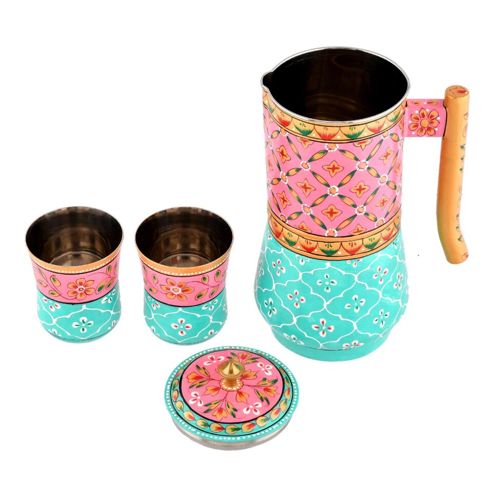 Aluminium Jug Set with 2 Glass Tumblers – 21 cm for kitchen Decor ,Table Top , And Home Decoration